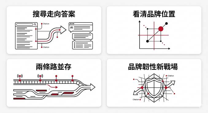 過去,品牌競爭多半發生在搜尋結果頁。現在,當使用者先問AI,品牌要面對的就不只是「有沒有被找到」,而是另一個更根本的問題:有沒有進入答案、被怎麼描述、又是被哪些來源支撐。