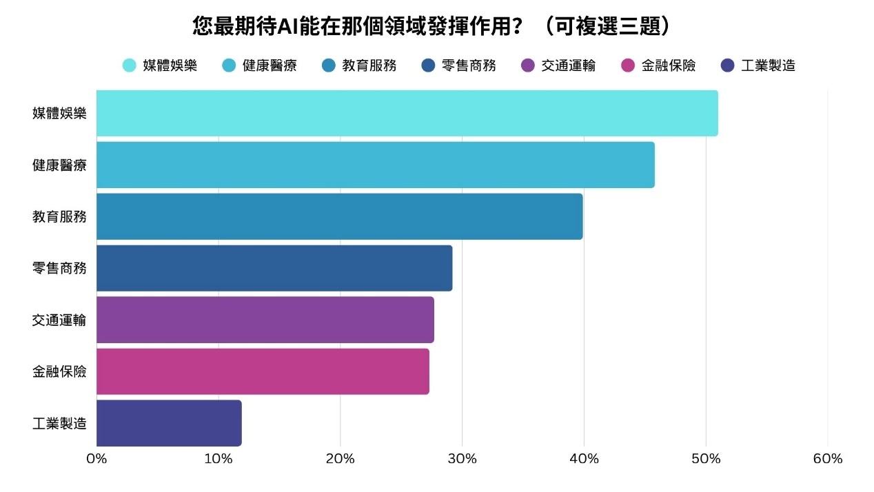 針對民眾最期待AI未來發揮作用的領域,媒體娛樂以51%居首,健康醫療45.8%居次,教育服務39.9%。不同年齡層的差異鮮明,年輕世代特別期待教育與娛樂,