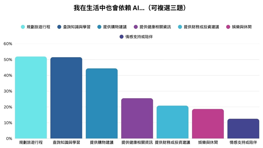 調查顯示,AI的生活應用已經相當廣泛。52%的受訪者曾用AI規劃旅遊行程,包括路線安排、景點推薦與搜尋美食、51%民眾則透過AI進行知識查詢與學習;另有44%人會利用AI獲得購物建議,從比價、商品推薦到折扣蒐集。