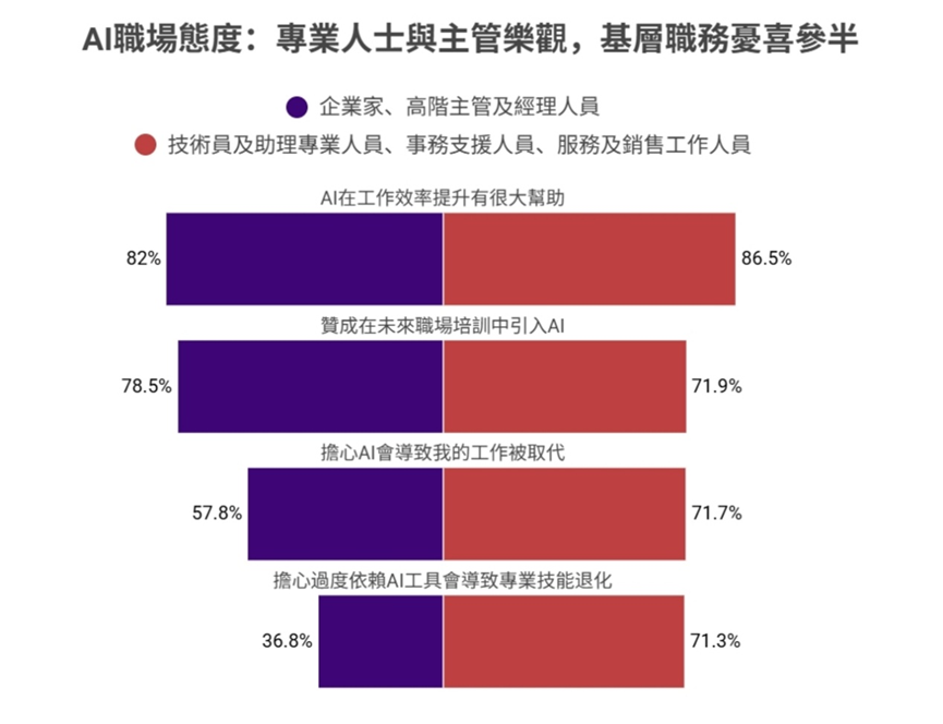 而基層職務群體展現出更為複雜的情緒。一方面,多達86.6%的受訪者認為AI對提升效率有顯著幫助,並有71.9%贊成在未來職場培訓中導入更多AI。另一方面,他們也同樣擔心AI帶來的負面影響。服務與銷售人員(74%)、技術員與助理專業人員(72%)、事務支援人員(68%)普遍憂慮長期依賴AI會導致技能退化,且超過七成擔心自身工作可能被取代。