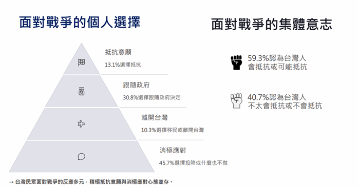 台灣民眾在面對戰爭爆發時的個人選擇呈現多元且矛盾的樣貌,積極的抵抗意願與消極的應對心態都有。數據顯示,當被問及個人將如何行動時,僅有13.1%的民眾明確表示會選擇「抵抗」 。與此相對,最大比例的民眾(45.7%)選擇了「消極應對」,即投降或什麼也不做 。另外,有30.8%的民眾選擇「跟隨政府決定」 ,而10.3%的人則表示會「移民或離開台灣」。
