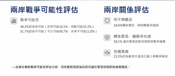根據民調,台灣社會對於兩岸爆發戰爭的可能性呈現顯著分歧,但主流民意傾向於認為,當前局勢雖處於緊張狀態,但尚無立即爆發戰爭的威脅 。數據顯示,對於戰爭發生的可能性,民眾看法幾乎一分為二 。有48.3%的受訪者認為兩岸「有可能」開戰(其中16.1%認為非常可能,32.2%有點可能) 。與此同時,也有51.7%的民眾認為「不可能」發生戰爭(其中40.7%認為不太可能,11.0%認為非常不可能) 。。